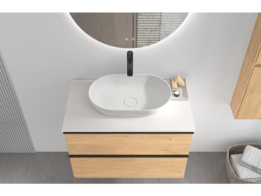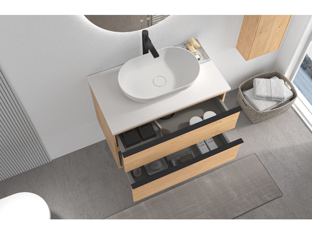 Koupelnové skříňky jsou vyrobeny z MDF lamina (středně hustá dřevovláknitá deska) s nalisovanou melaminovou fólií, která je odolná vůči vlhkosti, poškrábání, UV záření a běžným čisticím prostředkům. Povrch je hladký, tvrdý, homogenní a snadno se čistí. MDF desky se nekroutí jako masivní dřevo. Pokud dojde k mechanickému narušení laminace, samotné MDF jádro může navlhnout.