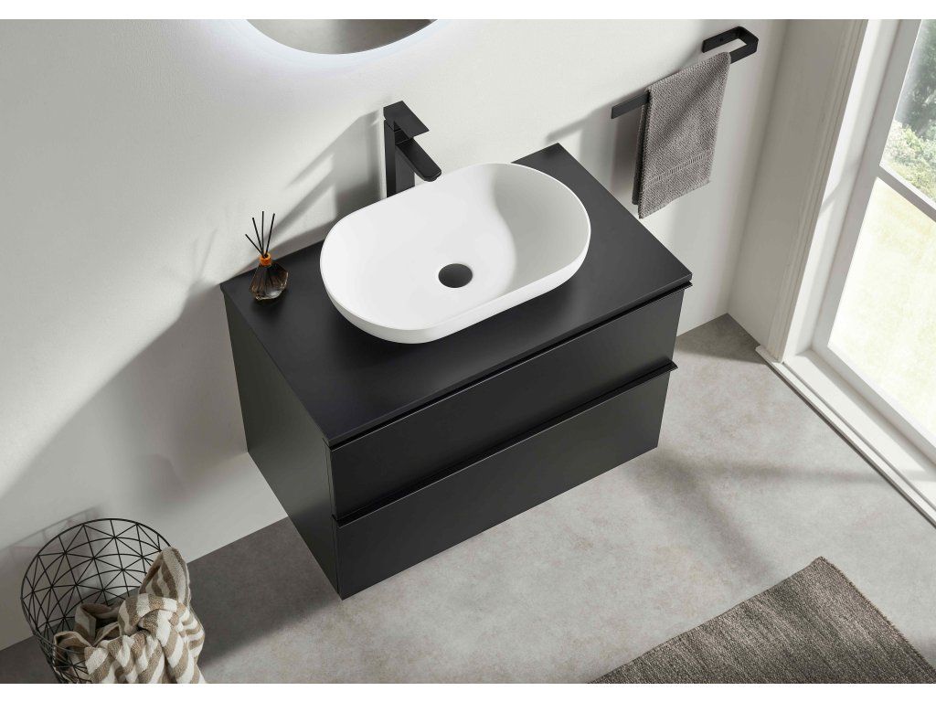 CERANO - Koupelnová skříňka Velora - černá matná, úchytka černá + deska pod umyvadlo Navira Slim - 18 mm - 60x54,8x46,5 cm