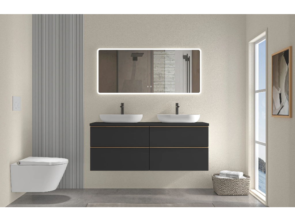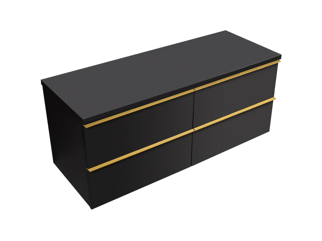 CERANO - Koupelnová skříňka Velora - černá matná, úchytka zlatá + deska pod umyvadlo Navira Pro - 36 mm - 160x56,6x46,5 cm