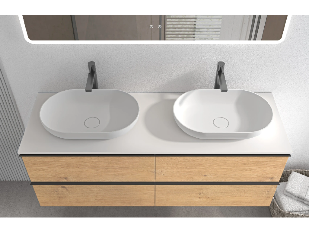 CERANO - Koupelnová skříňka Velora - dub medový, úchytka černá + deska z lit. mramoru Elanys - 12 mm - bílá matná - 160x54,2x46,5 cm
