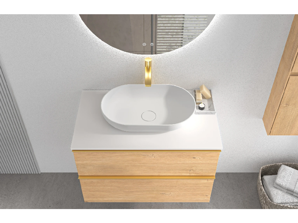 CERANO - Koupelnová skříňka Velora - dub medový, úchytka zlatá + deska z lit. mramoru Elanys - 12 mm - bílá matná - 60x54,2x46,5 cm