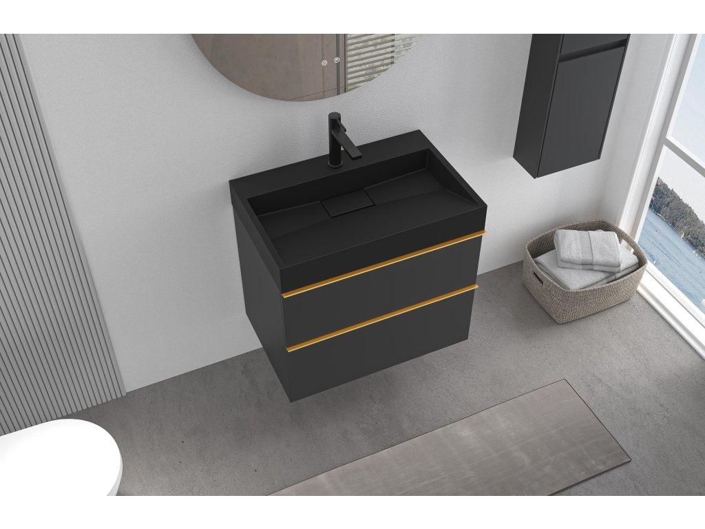 CERANO - Koupelnová skříňka Velora - černá matná - úchytka zlatá + umyvadlo s otvorem pro baterii z litého mramoru Vita - černá - 70x53x46 cm
