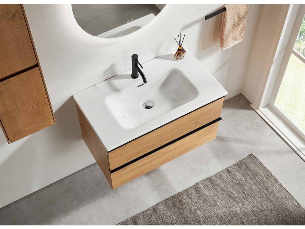 CERANO - Koupelnová skříňka Velora - dub medový, úchytka černá + keramické umyvadlo Novo - bílá lesklá - 81x54,5x46,5 cm