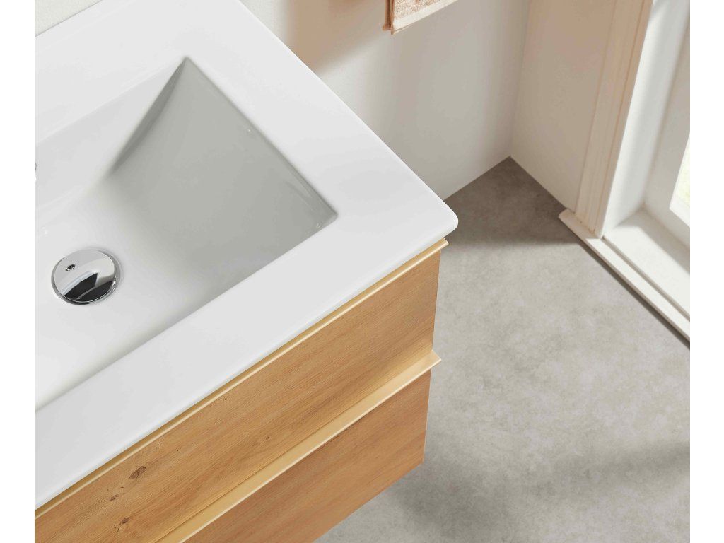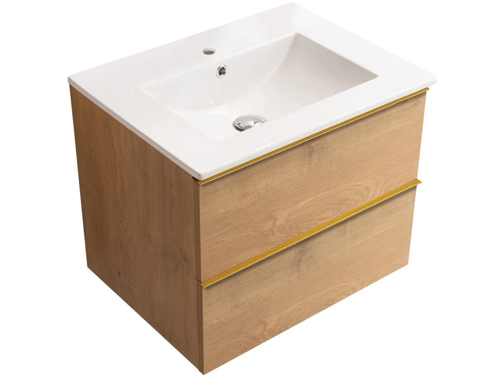 CERANO - Koupelnová skříňka Velora - dub medový, úchytka zlatá + keramické umyvadlo Todo - 71x55x46,5 cm