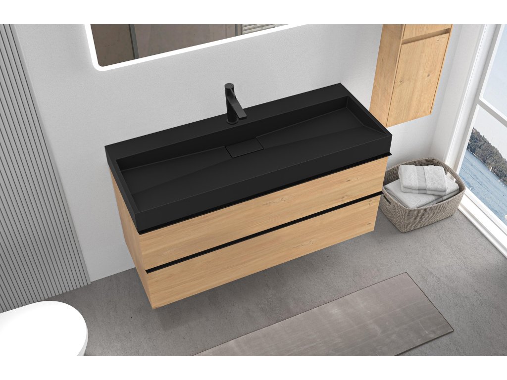 CERANO - Koupelnová skříňka Velora - dub medový - úchytka černá + umyvadlo s otvorem pro baterii z litého mramoru Vita - černá - 100x53x46 cm