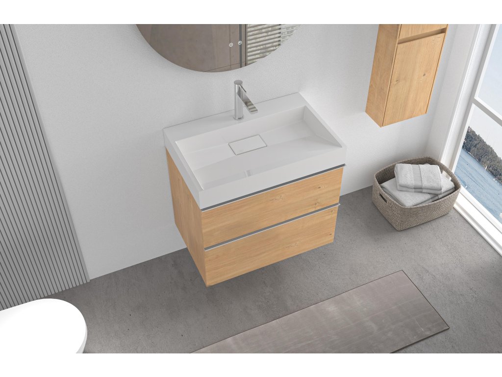 CERANO - Koupelnová skříňka Velora - dub medový - úchytka chrom + umyvadlo s otvorem pro baterii z litého mramoru Vita - bílá matná - 70x53x46 cm