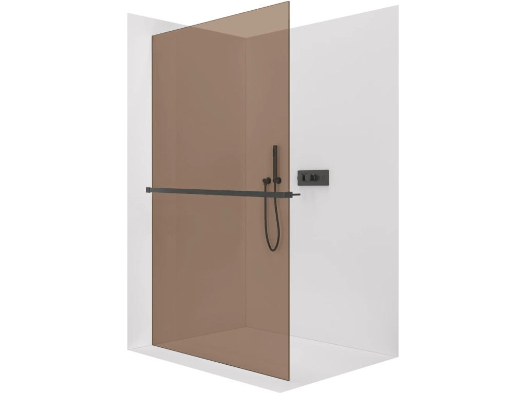 CERANO - Sprchová zástěna Walk-in Crystal L/P - 8 mm + polička/držák na ručníky - bezvzpěrový systém - černá matná, bronzové sklo - 140x200 cm