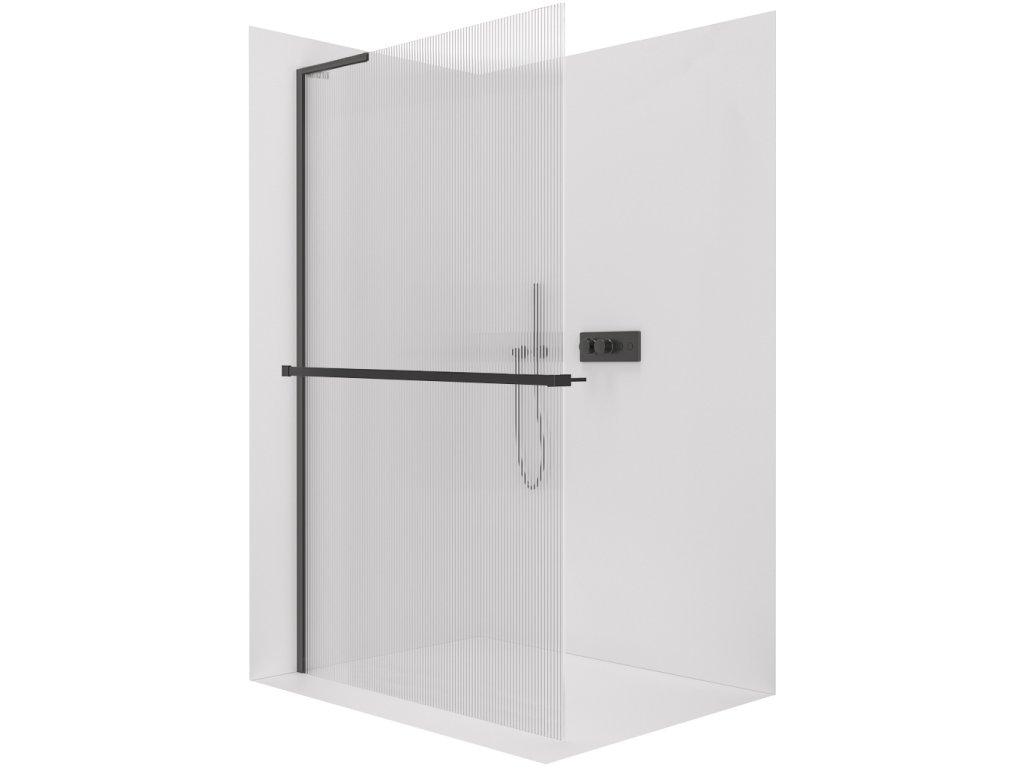CERANO - Sprchová zástěna Walk-in Onyx L-levá vzpěra - 8 mm + polička/držák na ručníky - černá matná, rýhované sklo - 150x200 cm