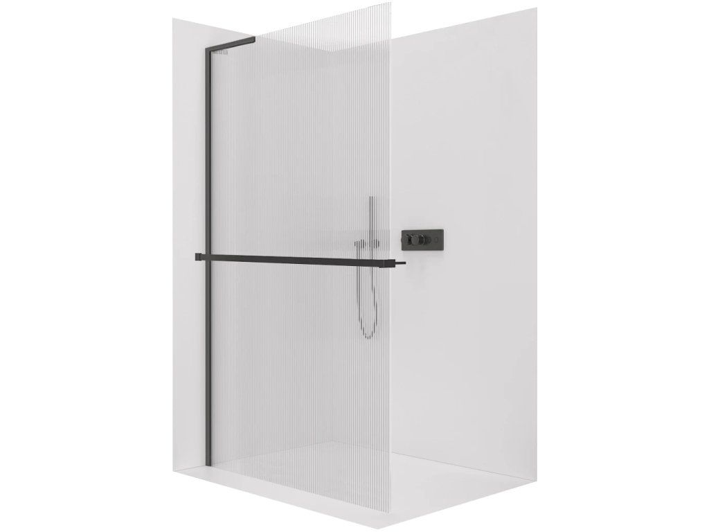 CERANO - Sprchová zástěna Walk-in Onyx L-levá vzpěra - 8 mm + polička/držák na ručníky - černá matná, rýhované sklo - 160x200 cm