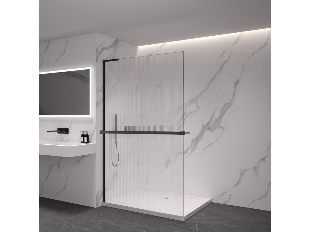 CERANO - Sprchová zástěna Walk-in Onyx L-levá vzpěra - 8 mm + polička/držák na ručníky - černá matná, rýhované sklo - 70x200 cm