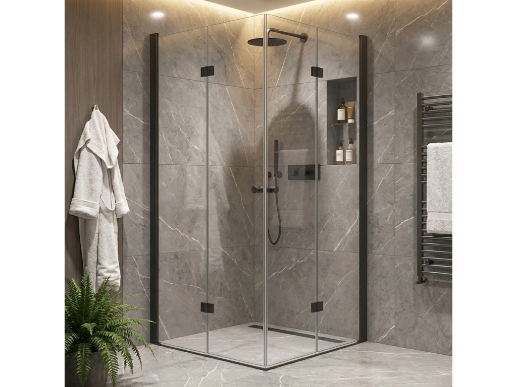 Sprchový kout je vybaven rukojetěmi vyrobenými z odolné slitiny zinku, které jsou ergonomicky tvarované pro snadnou manipulaci při otevírání a zavírání. Odolný pantový systém zajišťuje stabilitu dveří a dlouhodobou funkčnost skládacího mechanismu.