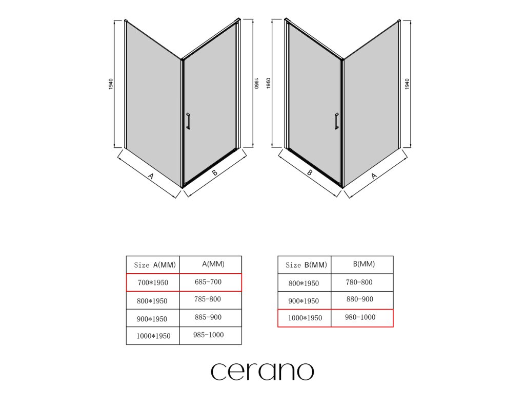 V rámci této série nabízíme širokou škálu rozměrů, abychom uspokojili různé potřeby našich zákazníků. Všechny sprchové kouty, dveře a zástěny značky CERANO jsou plně kompatibilní se sprchovými vaničkami CERANO ve stejných rozměrech, což zajišťuje bezproblémovou instalaci a dokonalé sladění. Sprchový kout lze navíc instalovat flexibilně – buď na odpovídající sprchovou vaničku, nebo přímo na podlahu podle vašich preferencí a možností koupelny.