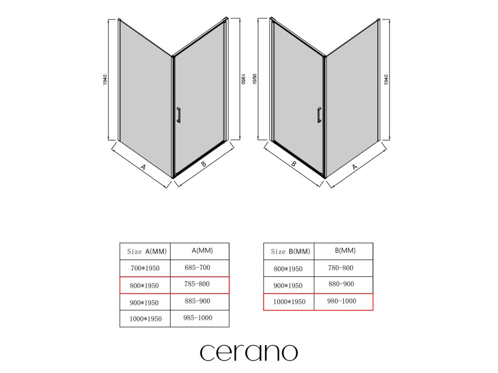 V rámci této série nabízíme širokou škálu rozměrů, abychom uspokojili různé potřeby našich zákazníků. Všechny sprchové kouty, dveře a zástěny značky CERANO jsou plně kompatibilní se sprchovými vaničkami CERANO ve stejných rozměrech, což zajišťuje bezproblémovou instalaci a dokonalé sladění. Sprchový kout lze navíc instalovat flexibilně – buď na odpovídající sprchovou vaničku, nebo přímo na podlahu podle vašich preferencí a možností koupelny.