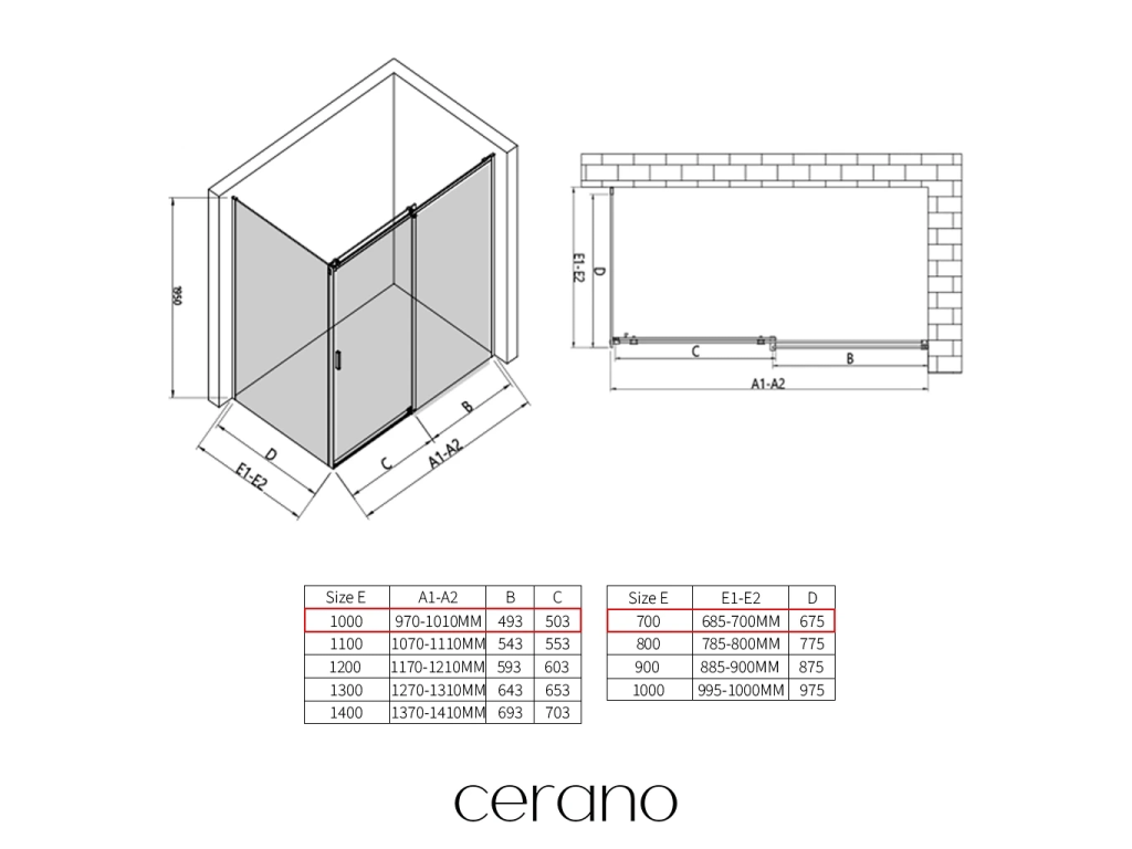 V rámci této série nabízíme širokou škálu rozměrů, abychom uspokojili různé potřeby našich zákazníků. Všechny sprchové kouty, dveře a zástěny značky CERANO jsou plně kompatibilní se sprchovými vaničkami CERANO ve stejných rozměrech, což zajišťuje bezproblémovou instalaci a dokonalé sladění. Sprchový kout lze navíc instalovat flexibilně – buď na odpovídající sprchovou vaničku, nebo přímo na podlahu podle vašich preferencí a možností koupelny.