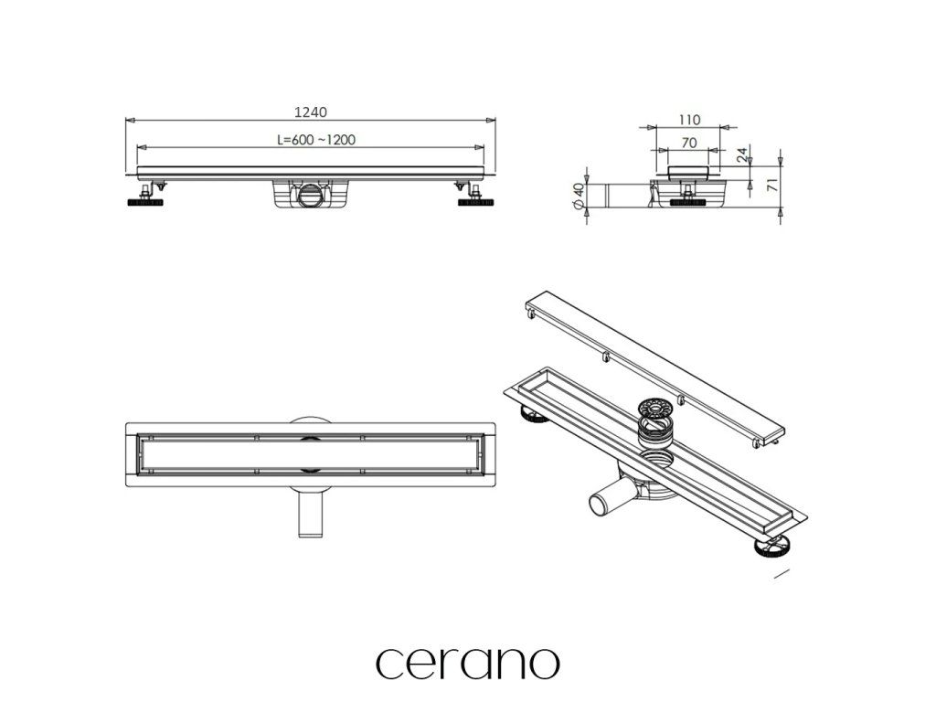 CERANO - Sprchový odtokový žlab, sifon otočný 360° - design 2v1 - nerez - DN40 - černá matná - 124 cm