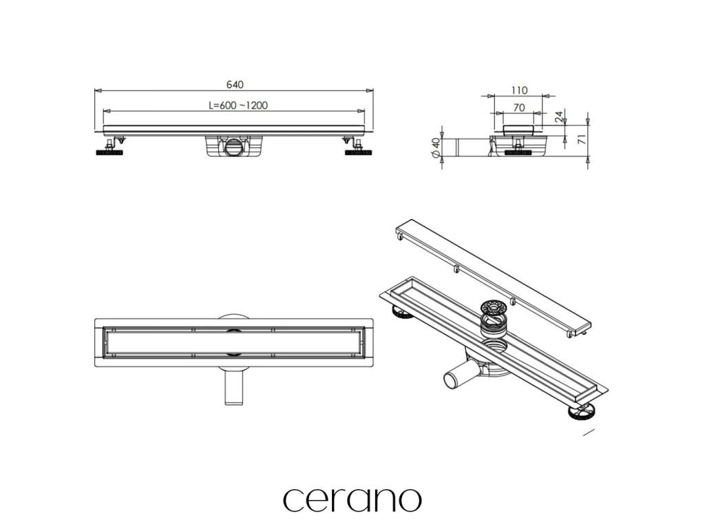 CERANO - Sprchový odtokový žlab, sifon otočný 360° - design 2v1 - nerez - DN40 - černá matná - 64 cm