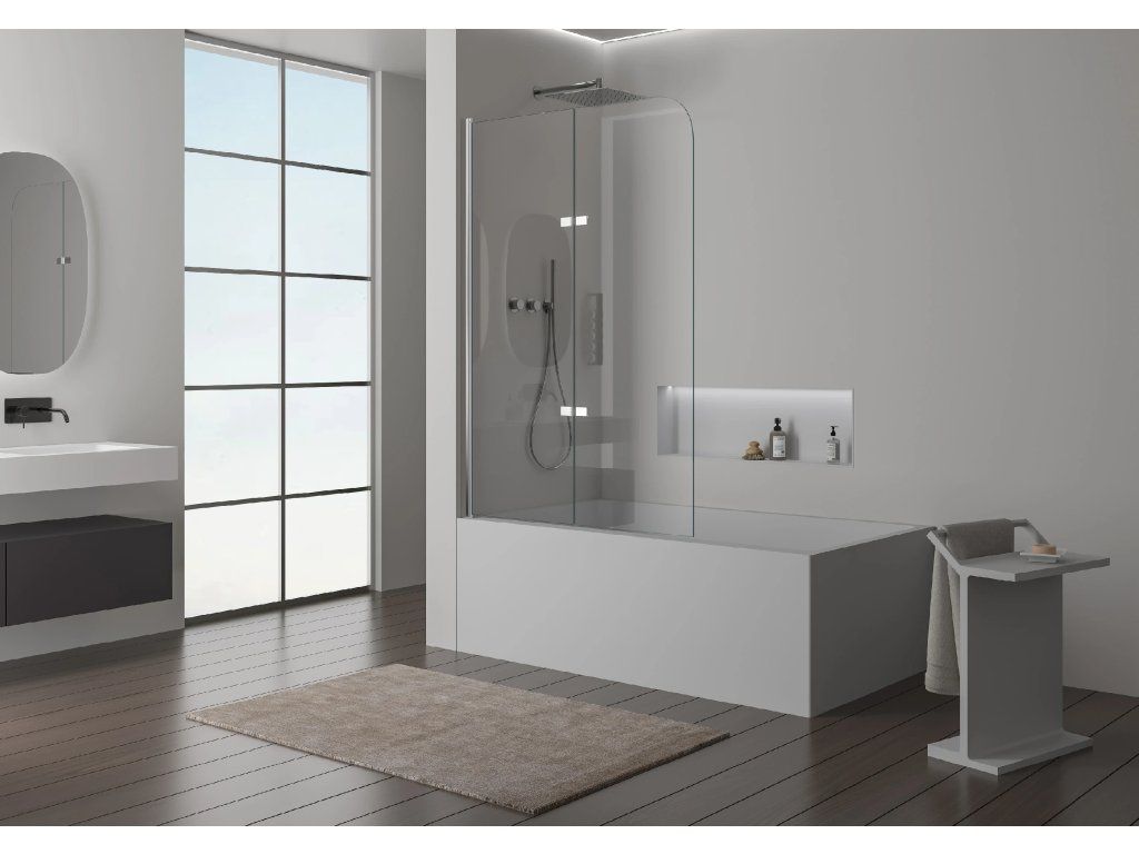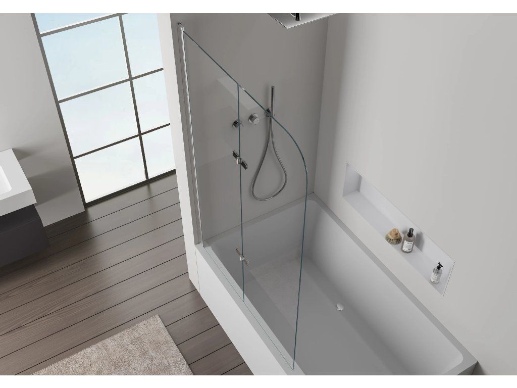 Zástěna je vyrobena ze dvou křídel s možností skládání. Toto řešení šetří místa v koupelně a umožňuje vám volně využívat zbývající prostor, pokud právě neužíváte koupací oblast.