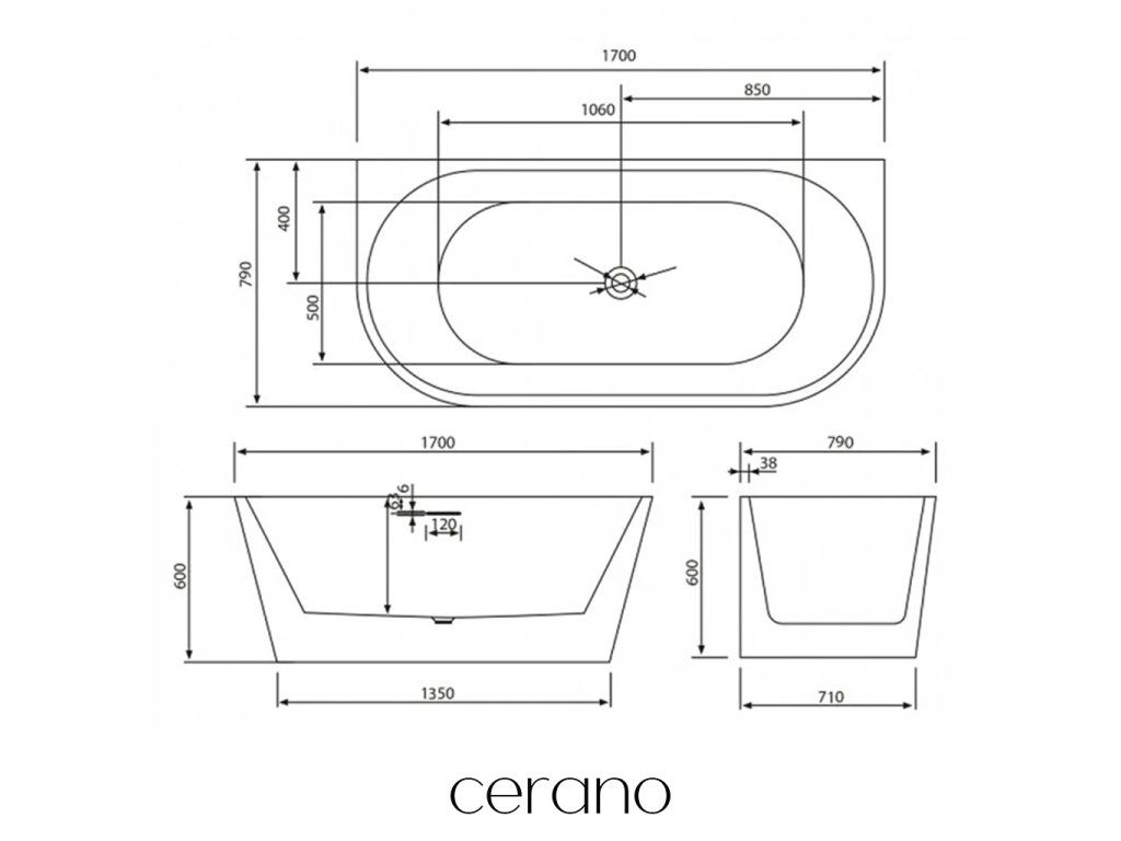 CERANO - Volně stojící akrylátová vana Grazia, nástěnná - bílá matná - 170x79 cm