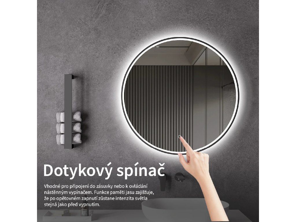 Osvětlení zrcadla lze snadno a pohodlně zapnout dotykem přepínače na panelu zrcadla. Umožňuje rychlé nastavení osvětlení bez nutnosti sahat po vzdálenějším tradičním vypínači.