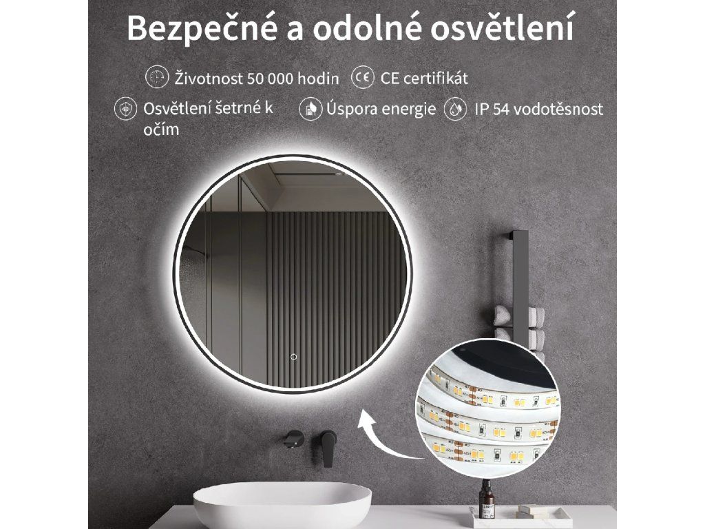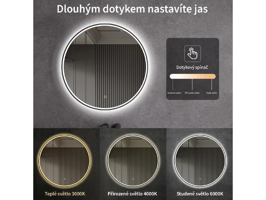 Zrcadlo je vybaveno LED osvětlením s nastavitelnou barvou světla – od 3000 K (teplá) do 6000 K (Neutrální). Přepínání barev jednoduše ovládáte dotykovým tlačítkem na ploše zrcadla. Poskytuje intenzivní a jasné světlo pro detailní péči i příjemné, jemné osvětlení pro relaxaci. Díky širokému rozsahu teploty barev tak snadno přizpůsobíte atmosféru aktuální potřebě.